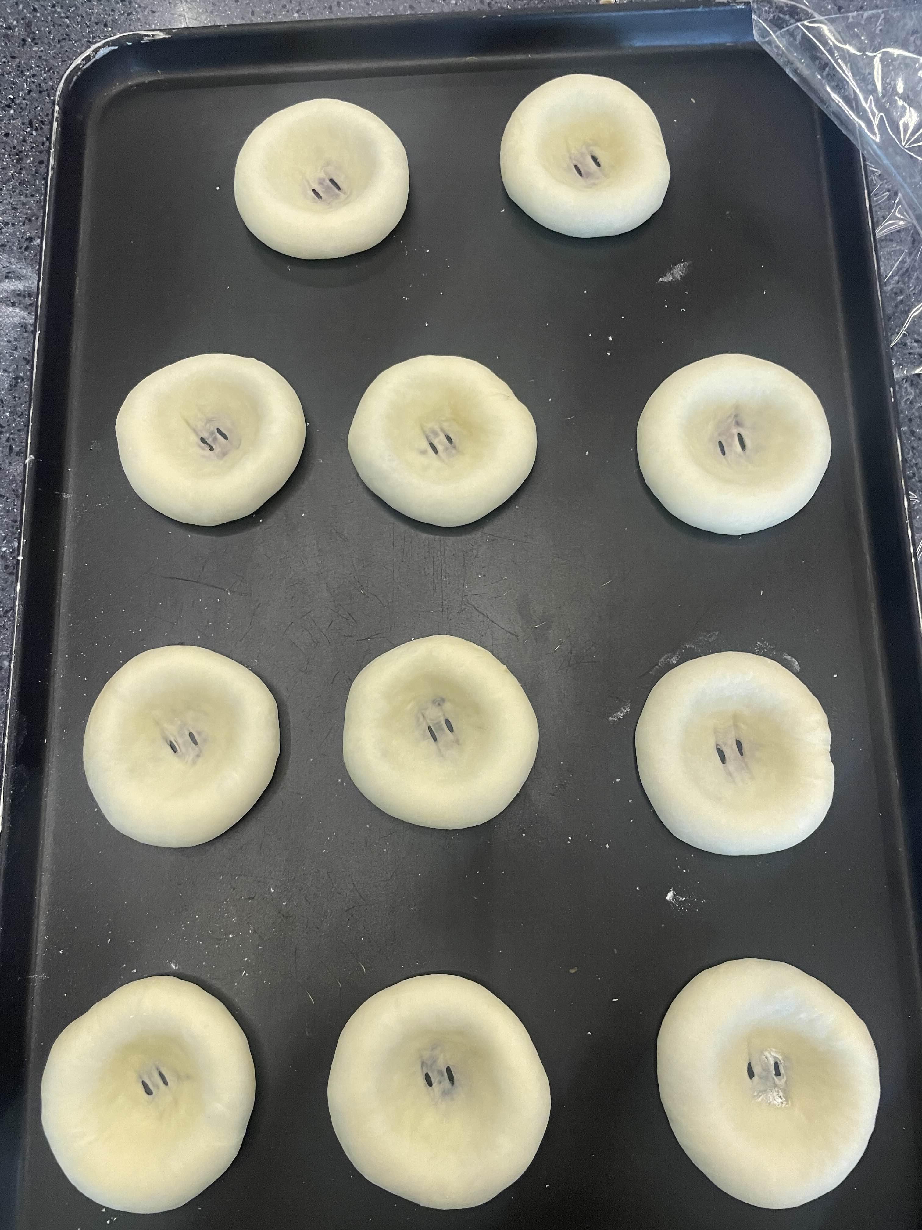 ✔️1차 발효 : 15~최대 30분 (시간보다는 상태를 살피며 , 손가락으로 꾹 찔렀을 때 살짝만 오므라지는 상태 및 바닥면 거미줄이 보여야 함) : 30분 넘기지 않아야 함