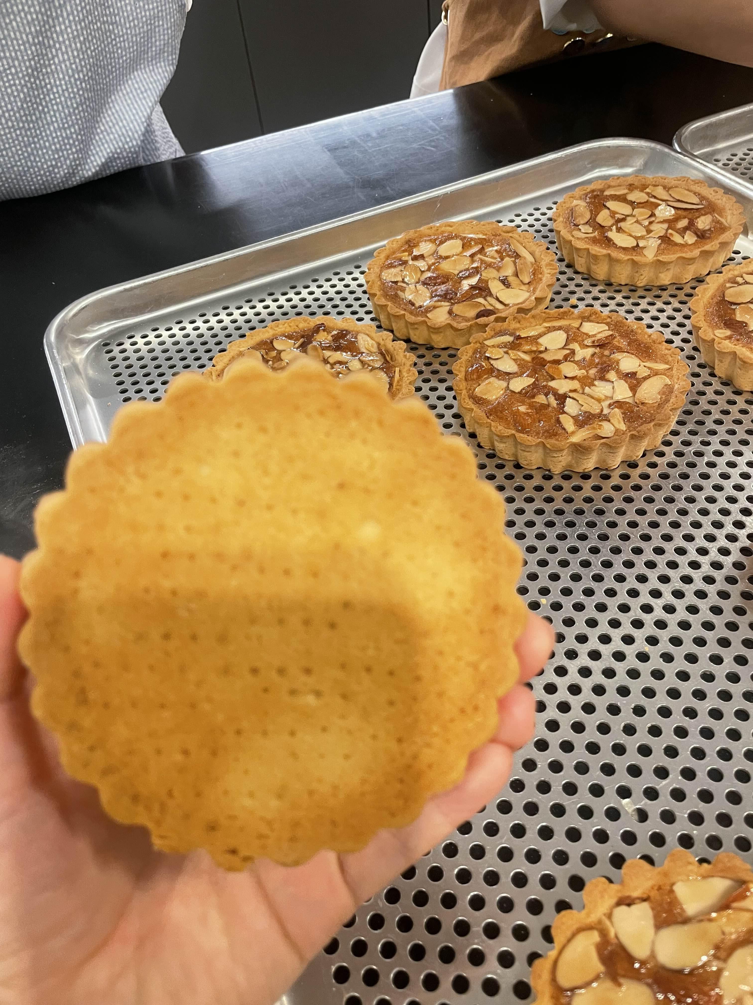 ✔️ 성형 : 냉장휴지 후, 반죽 조금 떼어 치데기 ▶️ 0.3cm 두께로 밀어펴기 (틀의 1.5배 크기) ▶️ 반죽을 틀에 올리고 퐁사주(반죽과 틀 사이 공기 제거 과정) ▶️ 피케 (반죽 바닥 포크질) ▶️ 충전물 달팽이 모양으로 60~70% 짜기 ▶️ 아몬드 균일하게 올리기