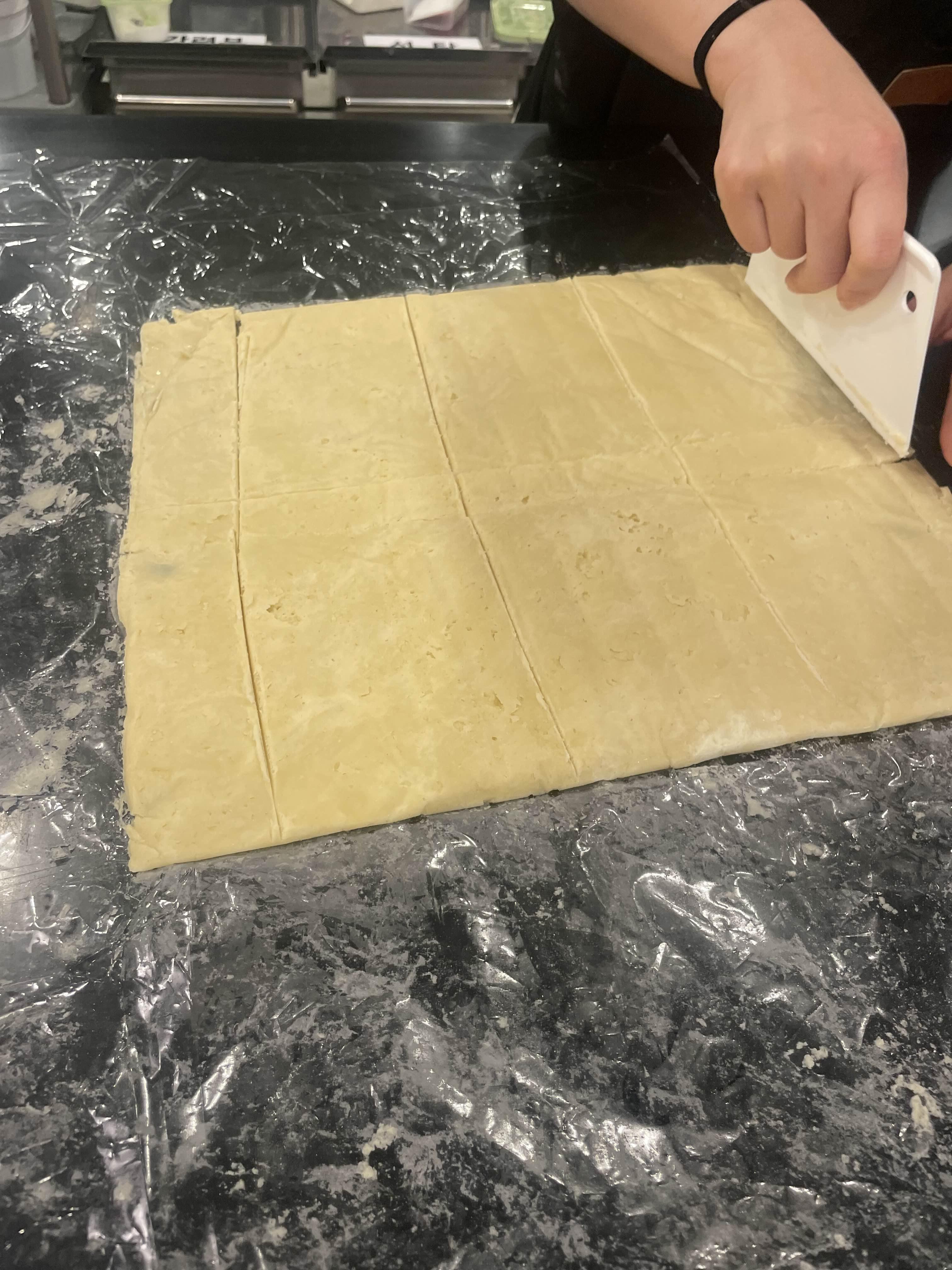 버터 포마드화 (마요네즈 질감) ▶️ 설탕 + 소금 넣고 아주 가볍게 섞어주기 ▶️ 계란 섞어서 여러번 나눠 섞어서 설탕 맛소금크기 될때 멈추기 (크림화 80%) ▶️ 체친 가루 넣고 가볍게 섞어주기 (#모양으로 섞기) ▶️ 비닐에서 마무리하고 얇은 사각모양으로 만든 후 냉장휴지 30분