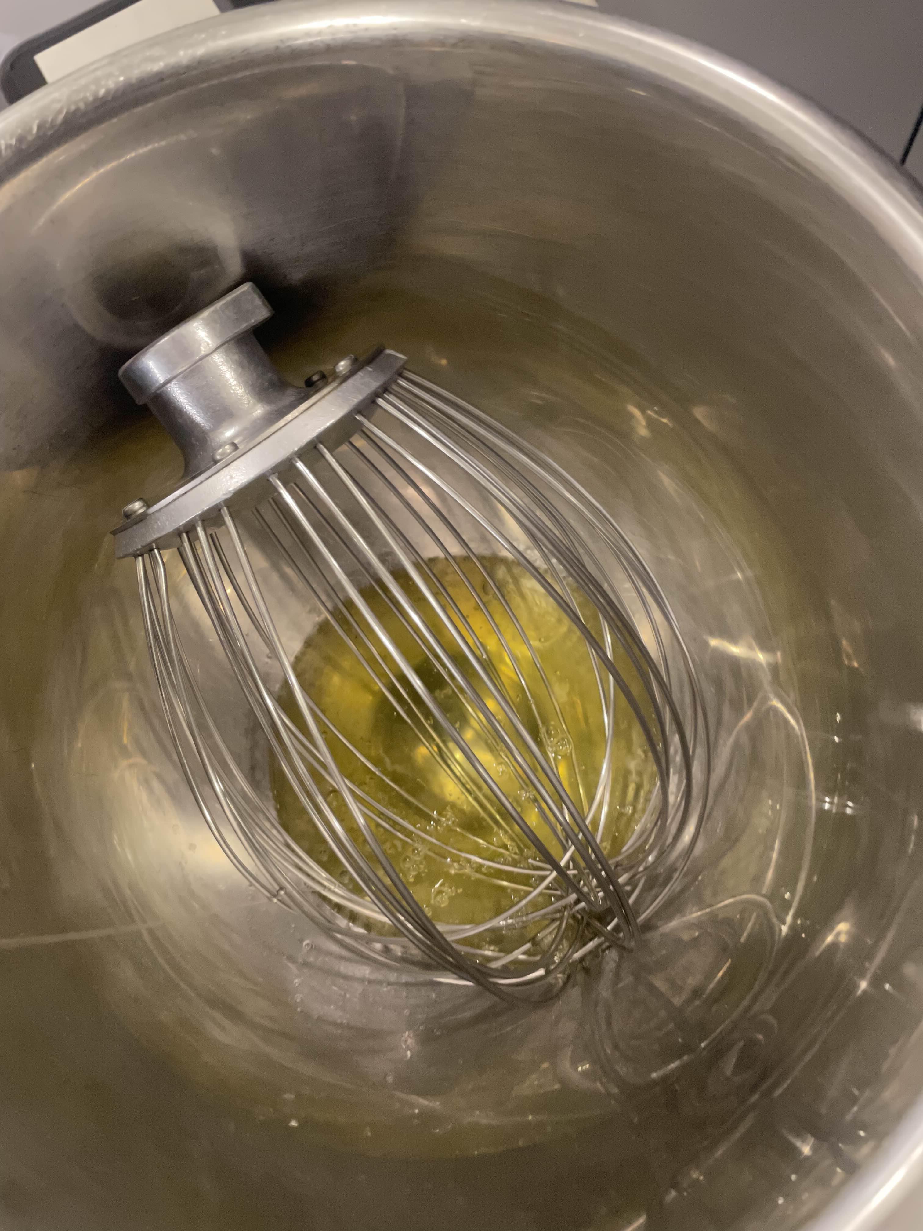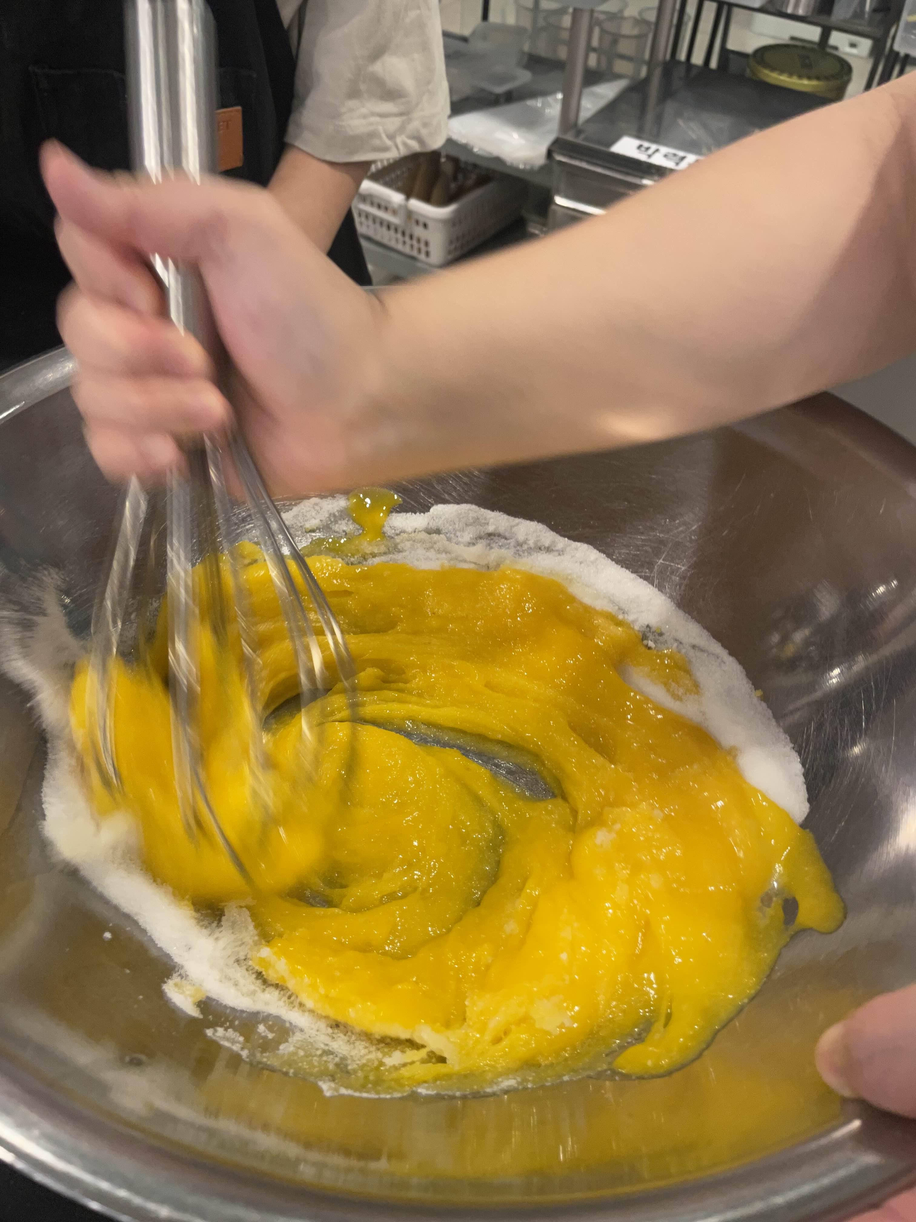 ✔️ 노른자 + 설탕 A + 소금 ▶️ 43도까지 중탕 후 손 휘핑 ▶️ 아이보리색 / 리방체크